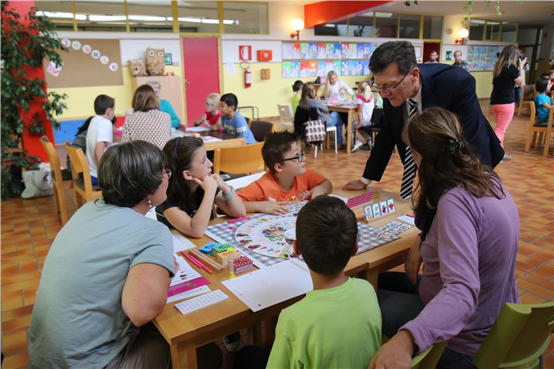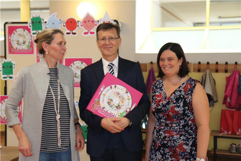 Schulamtsleiter Peter Höllrigl stellte das Ernährungsspiel Schmecktivity heute an der Grundschule Rudolf Stolz vor. Foto: LPA/Verena Hilber