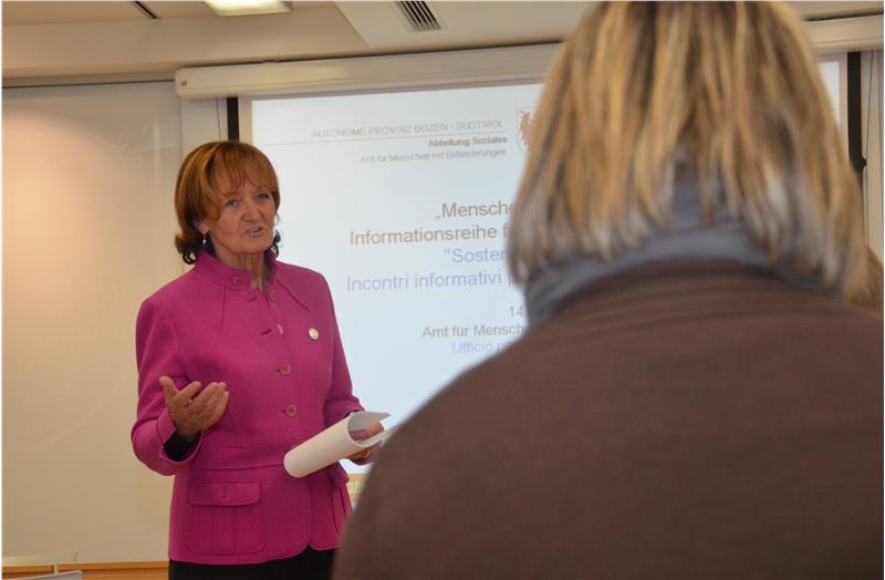 "Mit dieser Fortbildungsreihe wollen wir Informationen anbieten, Fragen beantworten und Zweifel zu verschiedenen sozialen Themen ausräumen", begrüßte Soziallandesrätin Martha Stocker die interessierten Gemeindesozialreferenten zum zweiten Informationsnachmittag "Menschen unterstützen" am Freitag (14. Oktober). Nach einem ersten Nachmittag zu den Sozialleistungen des Landes und zur aktuellen Situation der Asylbewerber in Südtirol im September, standen am vergangenen Freitag die aktuellen Leistungen und Angebote für Menschen mit Behinderung sowie die im Zuge des neuen Gesetzes geplanten Durchführungsbestimmungen im Mittelpunkt.