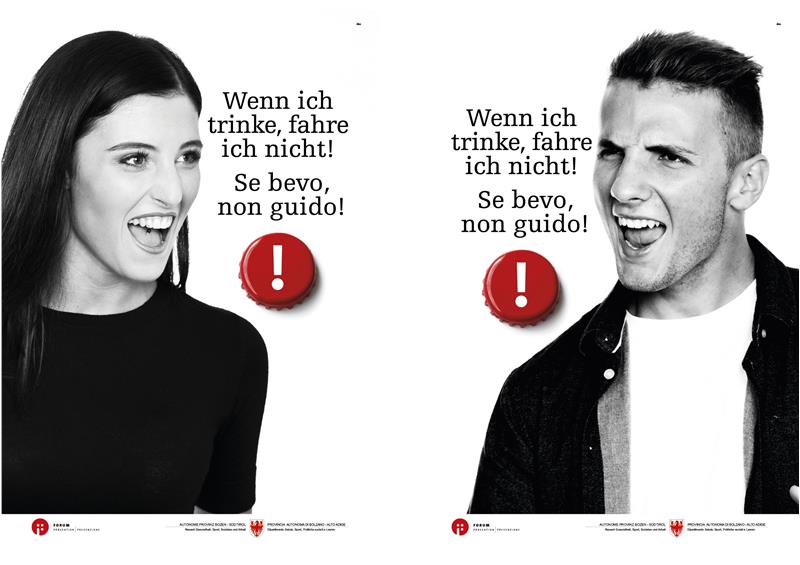 Die seit Jahren laufende Alkoholpräventionskampagne "Trinken mit Mass" wird in diesem Jahr um eine neue Idee erweitert: Nach dem Motto "Wenn ich trinke, fahre ich nicht" tragen Menschen aller Generationen gemeinsam dazu bei, die Bevölkerung für einen verantwortungsvollen Umgang mit Alkohol zu sensibilisieren. Junge Menschen werden dabei als Vorbilder gezeigt, die Generation 50plus erhält ein spezielles Augenmerk, wobei bewusst auf Stigmatisierungen und Drohbotschaften verzichtet wird. Über 100 Personen haben sich für das Fotoshooting gemeldet, 50 von ihnen sind die Gesichter der diesjährigen Auflage der Präventionskampagne. Die Teilnehmer stehen mit ihrem Gesicht für einen Großteil der Bevölkerung, die die Botschaft teilt und mitträgt. Es gibt weder Namen, noch Rollen oder Geschichten. Fokussiert wird auf folgende Ziele: die Punktnüchternheit im Straßenverkehr weiter fördern, die Alkoholkonsummengen bei den einzelnen Personen reduzieren und das Wissen über Alkohol und dessen (schädliche) Wirkung bei der Bevölkerung erhöhen. Für die aktuelle Kampagne werden Straßenschilder, Busse, Plakate, Zeitungsanzeigen und Werbebanner genutzt. Die Webseite trinkenmitmass.it macht alle laufenden Maßnahmen und Projekte sichtbar, ein Faltblatt informiert zusätzlich über die mit Alkoholkonsum verbundenen Risiken.