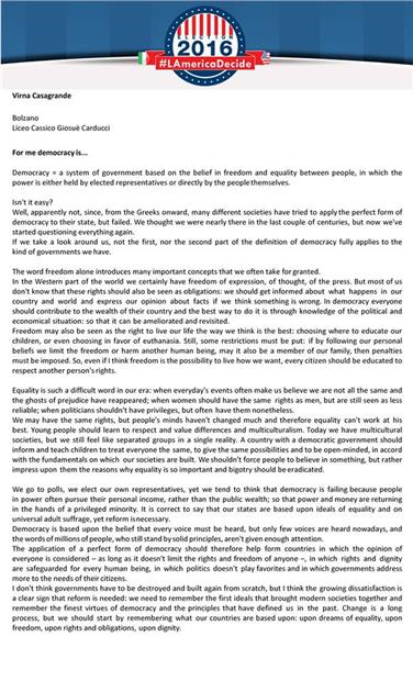 Die Teilnehmer des Wettbewerbs konnten einen Text, ein Video oder eine Zeichnung zu den Präsidentschaftswahlen in den USA einreichen. Die Schülerin der 4 B am italienischen Klassischen Gymnasium Carducci in Bozen hat in der Kategorie "Texte" mit einem Aufsatz zum Thema "For me democracy is…" den ersten Platz erreicht, in dem sie über Demokratie, Freiheit, Gleichheit und Multikulturalität schrieb. Unterstützt wurde Virna dabei von ihrem Englischlehrer, Andrea Pezzuto.