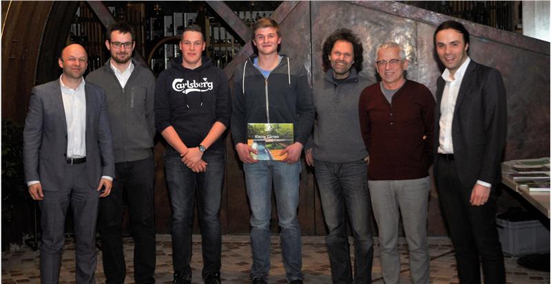 Die jungen Europameister im Gartenbau: Evi Tschager (3. v.l.), Felix Unterhofer (4. v.l.) und Florian Unterhofer (5. v.l.) mit Landesrat Philipp Achammer (1. v.r.), Schuldirektor Paul Miar (2. v.l.), Koordinator Florian Stuefer (1. v.l.). Foto: LPA
