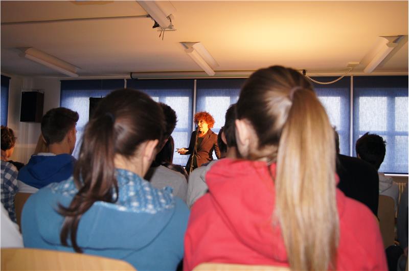 Literaturunterricht einmal anders – die Südtiroler Autorin Sabine Gruber während ihrer Lesung an der Oberschule für Landwirtschaft in Auer (2015)
