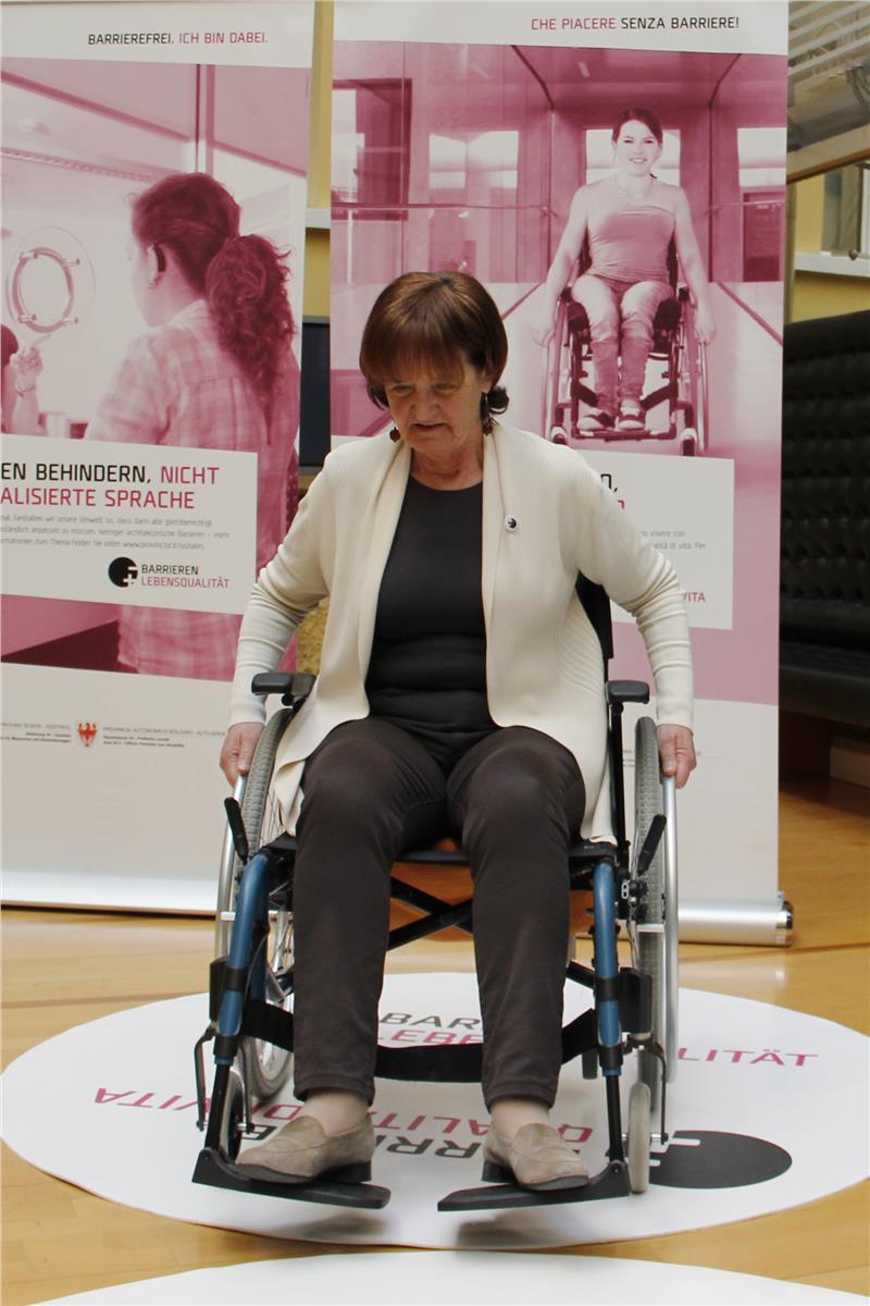 50 Teppiche mit dem Logo der dreijährigen Sensibilisierungskampagne des Landes mit dem Motto „Weniger Barrieren, mehr Lebensqualität“ werden demnächst in den Eingangsbereichen der Landhäuser und des Landtages, in den Rathäusern der großen Gemeinden, in den Sprengelsitzen der Bezirksgemeinschaften, in den Sitzen der Berufskammern, in den technischen Fachoberschulen und der Universität für Bildungswissenschaften ausgelegt. Die Teppiche haben einen Durchmesser von 1,5 Metern und sollen den Bedarf an notwendiger Rotationsfläche aufzeigen, um sich selbständig und autonom bewegen zu können.