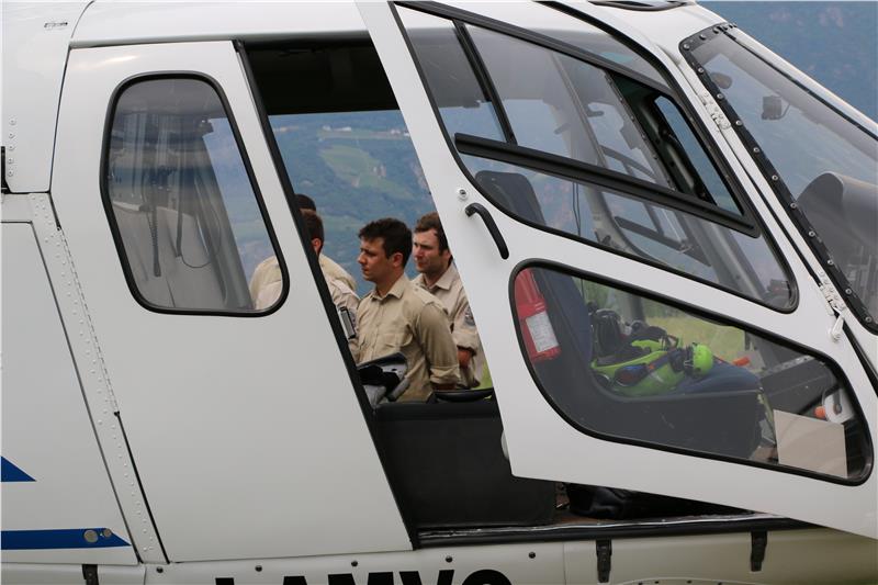 Ein Wasserbecken steht ganz oben auf der sanierten ehemaligen Mülldeponie in Sigmundskron, daneben aufgereiht Feuerwehrautos. Männer in Uniform mit dem Abzeichen der Berufsfeuerwehr Bozen folgen, mit dem Helm unterm Arm, den Ausführungen des Piloten. Gleich wird der Hubschrauber abheben und einen gefüllten Wasserkübel mehrmals über einer Fläche auskippen, die für diese Übung ausgewählt wurde. 40.000 Bäume hat das Forstinspektorat Bozen 1 in den vergangenen Jahren auf der Alt-Deponie gepflanzt; für diese Übung von zwölf angehenden Feuerwehrmännern bildet ein Abschnitt die Grundlage für einen fiktiven Waldbrand.