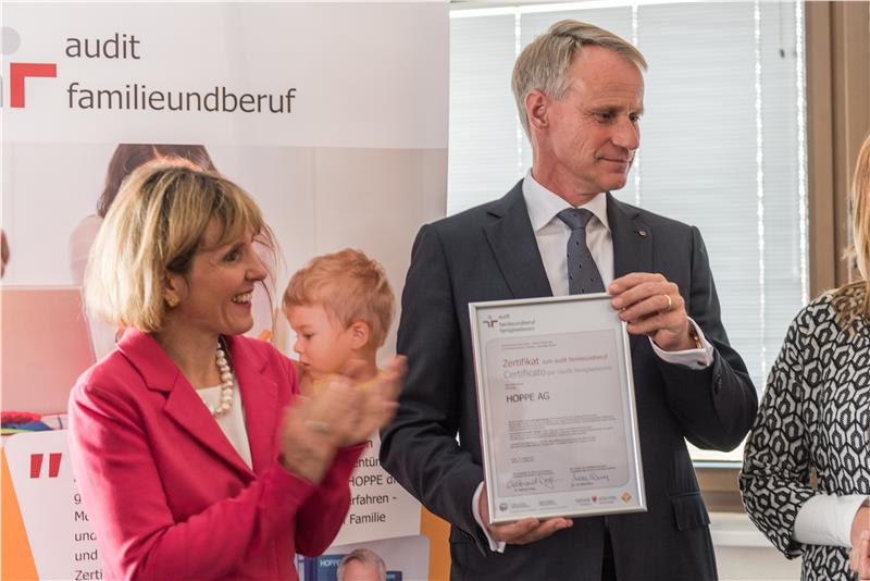 Seit der Einführung des Audits "familieundberuf" im Jahr 2004 haben 60 Südtiroler Unternehmen das Zertifikat erhalten. Hoppe ist jedoch das erste Unternehmen, das mit der Durchführung des Re-Audit-Dialogs das höchste Niveau dieses Prozesses erreicht hat. "Familienfreundlichkeit tagtäglich zu leben ist nicht nur eine Organisationsfrage sondern eine Haltung, die bei Hoppe spürbar ist und sich auch in der Wertekultur des Unternehmens widerspiegelt", betonte der Präsident der Handelskammer Bozen, Michl Ebner.