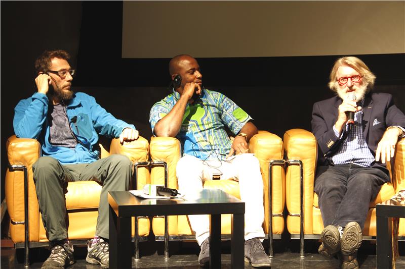 Podiumsdiskussion zum Thema Landflucht: (v.li.) Alain Christian Essimi Biloa, Moderator Matthias Abram und Landesrat Richard Theiner. Foto: LPA/mgp