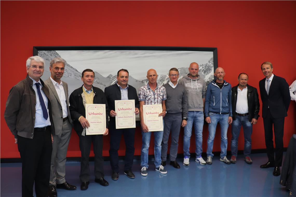 Landesrat Schuler und Agenturdirektor Pollinger dankten gemeinsam mit Ressortdirektor Klaus Unterweger und dem stellvertretenden Agenturdirektor Günther Walcher und den vier Amtsdirektoren der Agentur für Bevölkerungsschutz den zwölf Arbeitern der Wildbachverbauung für ihren 19- bis 36jährigen Einsatz.
