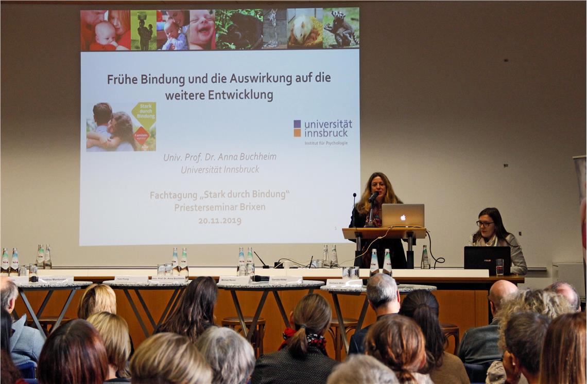 Vorab hatte die Psychologin und Psychoanalytikerin Anna Buchheim, Dekanin der Fakultät für Psychologie und Sport der Universität Innsbruck, die Forderung nach einer guten Basis für Bindung unterstützt. Die frühe und frühkindliche Bindung wirke sich maßgeblich auf das spätere Erwachsenenleben, befördere das Selbstwertgefühl, unsichere Bindungen würden pathologisch nachweisbare Ausschüttungen von Stresshormonen befördern. "Sichere Bindungen haben eine hohe Schutzfunktion", hob Buchheim hervor. Diese These wurde von Philosophen und ehemaligem Oberschullehrer Sandro Tarter und Psychologen Andrea Mantovani praxisnah unterstrichen. "Es ist wichtig, Bindung und Verbindung zu halten, auch wenn die Situation schwierig ist", hob Tarter hervor.