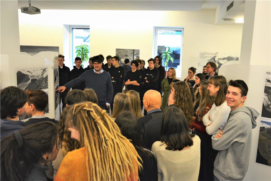 Roberto Dinale, Direktor im Landesamt für Hydrologie und Stauanlage sowie Kurator der Ausstellung, führte die angemeldeten Schulklassen durch die Bilderschau: In Fotovergleichen "Früher-Heute" und mit zeitgerafften Satelittenbilder-Slides steht die Gletscherwelt der Südtiroler Alpen auf dem Prüfstein.