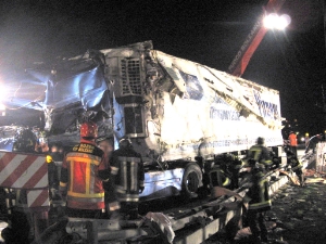 Auf der Vinschgauer Staatsstraße bei Laas kam es in der Nacht vom 7. auf den 8. April 2005 gegen 23.00 Uhr zu einem folgenschweren Verkehrsunfall mit einem LKW. Dabei stürzte ein Sattelschlepper um und der Fahrer wurde in seiner Führerkabine schwer eingeklemmt. Nach einer intensiven und schwierigen Rettungsaktion konnte der Fahrer von den Freiwilligen Feuerwehren Laas und Eyrs mittels hydraulischen Rettungsgeräten befreit werden und vom Notarztteam des Weißen Kreuz Schlanders erstversorgt und schließlich mit mittelschweren Verletzungen ins Krankenhaus Schlanders eingeliefert werden. Anschließend wurde das gesamte Ladegut des Kühlsattelaufliegers von Hand entladen, um mit den Bergungsarbeiten beginnen zu können. Mittels zwei schweren Kranfahrzeugen der Berufsfeuerwehr Bozen wurde der LKW wieder auf die Räder gestellt und schließlich auf einen naheliegenden Parkplatz abgeschleppt. Nach einer sechsstündigen Bergungsaktion konnte um 05.00 Uhr die Staatsstraße wieder für den Verkehr freigegeben werden. Neben Feuerwehr und Rettungsdienst waren die Landesstraßenverwaltung und die Carbinieri Schlanders im Einsatz.