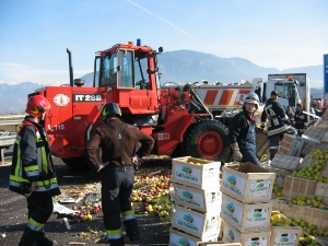 Nachdem der beschädigte Anhänger mit dem Kranwagen geborgen war, mußte die Berufsfeuerwehr zusammen mit den Kollegen der Freiwilligen Feuerwehr Terlan die auf der Fahrbahn verstreuten Äpfel mit einem Radlader und mit Hand auf drei LKW's verladen, die der Strassendienst des Landes vor Ort gerufen hatte.