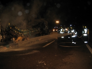 Am Montag, den 13.02.2006 um 02.40 Uhr kam es in Folge eines technischen Fehlers beim Auflieger eines LKW’s während der Fahrt zu einem Brand, der sich rasch auf das Gehäuse (Isoliermaterial des Kühlwagens) ausgebreitet hat.