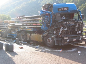 FOTO VVFBZ BFBZUm 7:28 Uhr ist die Berufsfeuerwehr Bozen zu einem Verkehrsunfall auf die Südspur der Brennerautobahn bei Km 76, gerufen worden. Der Unfallhergang, an dem acht Fahrzeuge beteiligt waren, wird derzeit noch von der Strassenpolizei ermittelt. Insgesamt waren vier Sattelzüge, zwei Lieferwagen und zwei PKW's beteiligt. Trotz des hohen Sachschaden an den Fahrzeugen, wurde nur eine Person leicht verletzt. Der Unfall ereignete sich kurz vor dem Tunnel auf der Höhe von Kardaun. Die Unfallstelle erstreckte sich auf eine Länge von ca. 100 m, wobei zwei der beteiligten Fahrzeuge erst im Tunnel zum stehen kamen. Von den verwickelten Unfallfahrzeugen wurde ein PKW und zwei Sattelzüge stark, die anderen nur leicht beschädigt. Die beiden Sattelzüge waren zum einem mit Betonblöcken, zum anderen mit Stückgut beladen. Nachdem die Fahrspuren von herumliegenden Teilen und ausgelaufenen Betriebsmitteln gereinigt war, konnten die insgesamt 25 Tonnen schweren Betonblöcke mittels Kranwagen der Berufsfeuerwehr auf einem anderen Sattelauflieger umgeladen werden. Die Südspur war während der Bergungsarbeiten für ca. 2 Stunden zunächst voll gesperrt. Nach einer weiteren Stunde konnten beide Fahrspuren gänzlich für den Verkehr freigegeben werden.