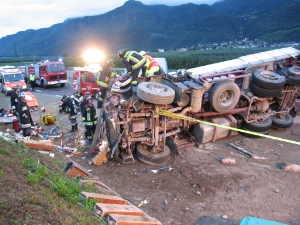 Der Lenker war in der Fahrerkabine eingeklemmt - die Bozner Berufsfeuerwehr und die Freiwilligen Feuerwehren von Terlan und Vilpian brauchten einige Zeit, um ihn herauszuschneiden.