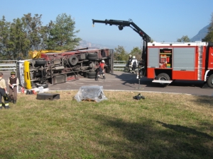Es handelte sich um einen Zweiachser mit ca. 12 Tonnen Geamtgewicht, welcher aus ungeklärten Gründen seitlich umkippte und somit die gesamte Straße bei km 2,5 Richtung Montan blockierte. Nach Eintreffen der zuständigen Feuerwehr Montan wurde die Lage erkundet und zur Unterstützung die Stützpunktfeuerwehr Neumarkt mit dem schweren Rüstfahrzeug, und die Berufsfeuerwehr Bozen mit der Kranmannschaft nachalarmiert. Nachdem der LKW mit Maschinenteile beladen, von den Einsatzkräften entladen war, konnte das Fahrzeug mittels der Rüstfahrzeuge wieder auf die vier Räder gestellt werden. Die Straße war während der Bergungsarbeiten für 1,5 Sunden komplett gesperrt. Der LKW-Fahrer hat sich nicht verletzt, der Sachschaden hält sich in Grenzen. Im Einsatz waren die FF Montan, FF Neumarkt sowie die Berufsfeuerwehr Bozen. Ein Rettungswagen des Weissen Kreuzes Unterland und die Carabinieri. Das Fahrzeug wurde anschließend von einer Privatfirma abgeschleppt.
