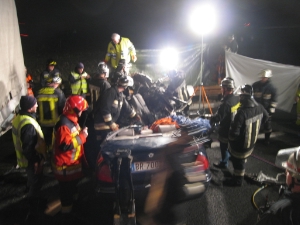 Gegen 19:30 wurde die Berufsfeuerwehr Bozen zu einem folgenschweren Unfall auf die Südspur km 52 (kurz vor der Ausfahrt Klausen) der Autobahn gerufen. Am Unfallort angekommen stellten wir fest, dass ein PKW mit enormer Wucht auf einen in der Haltebucht parkenden Sattelschlepper aufgefahren war. Der PKW wurde dabei unter den Sattelanhänger gedrückt. Trotz des schnellen Einsatzes der Rettungskräfte konnte man für die drei Personen, darunter ein Kleinkind, nichts mehr machen. Sie verstarben noch an der Unfallstelle. Für die Bergung der Personen mittels schweren Kranfahrzeuges, mußte die Autobahn für ca. zwei Stunden gesperrt werden. Der Fahrer des Sattelschleppers erlitt einen leichten Schock und wurde durch ein geschultes Team des Rettungsdienstes betreut. Im Einsatz standen ca. 40 Rettungskräfte, darunter die Freiwilligen Feuerwehren von Vahrn, Brixen, Klausen sowie Straßenpolizei und Personal des Rettungsdienstes 118.