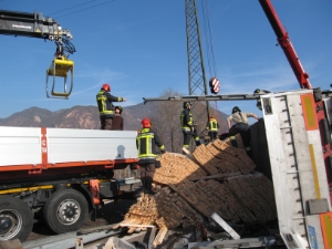 Am späten Vormittag wurde die Mannschaft der Berufsfeuerwehr Bozen zu einem Verkehrsunfall auf die MEBO bei der Ausfahrt Eppan gerufen. Dort war ein von süden kommender Sattelzug an der Ausfahrt umgekippt. Die Ladung, welche aus Holzlatten mit einem Gewicht von ungefähr 25-30t bestand, verteilte sich auf der Aus- bzw. Einfahrt der MEBO. Der Fahrer des LKW wurde glücklicherweise nur leicht verletzt. Das gesamte Holz wurde von der Mannschaft mit Hilfe von zwei Kränen auf einen LKW der Berufsfeuerwehr verladen um es zum  Parkplatz an der Autobahnausfahrt Bozen Süd zu transportieren. Daraufhin konnte der umgekippte Sattelzu angehoben werden. Die Ein- bzw. Ausfahrt war bis zum späten Nachmittag gesperrt, da sich die Arbeiten auf Grund der beengten Verhältnisse sehr aufwendig gestaltete. Unterstützt wurde die Berufsfeuerwehr Bozen von der Freiwilligen Feuerwehr von Terlan. Der Straßendienst sicherte die Einsatzstelle und beseitigte die beschädigten Leitplanken und Straßenschilder. Weiters waren Mannschaften des Weisen Kreuz, der Carabinieri und der Straßenpolizei im Einsatz.
