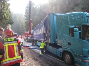 Foto BF BZ - VVF BZAm Montag, den 07. März 2011 um 09.00 Uhr ist diese Berufsfeuerwehr mit der Kranmannschaft zur Verstärkung von der Freiwilligen Feuerwehr Montan auf die Fleimstaler Strasse auf der Höhe des "Brückenwirtes" in der Nähe der Aldeinerbrücke gerufen worden. Ein mit Nudel beladener LKW mit Anhänger ist seitlich umgekippt und hat die Staatstrasse teilweise blockiert. Mit einem Kranwagen der Berufsfeuerwehr, einem zweiten einer privaten Firma und einer Seilwinde wurde der LKW samt Anhänger wieder auf die Räder gestellt. Die Ladung des LKW's wurde zuerst auf einen anderen LKW umgeladen. Der Fahrer wurde leicht verletzt. Während der Bergungsarbeiten blieb die Staatstrasse für ca. 3 Stunden zumindest einspurig blockiert. Vor Ort waren neben der Freiwilligen Feuerwehr Montan und dieser Berufsfeuerwehr auch das Weisse Kreuz von Neumarkt, der Landesstrassendienst, die Carabinieri und die Strassenpolizei.
