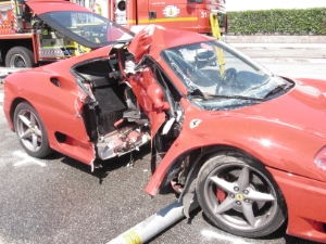 Heute. Sonntag, 29.Juli 2012 ist die Berufsfeuerwehr Bozen von der Landesnotrufzentrale zu einem schweren Verkehrsunfall in die Einsteinstrasse in Bozen alarmiert worden. Zwei Personen fuhren in einem Ferrari 360 Modena die Einsteinstrasse entlang als sie die Herrschaft über das Fahrzeug verloren haben und gegen einen Masten der Strassenbeleuchtung prallten, anschliessend wurde das Fahrzeug samt Laternenmast ca. 30m auf die Gegenfahrbahn katapultiert. Durch den heftigen Aufprall wurden sowohl Fahrer als auch Beifahrer verletzt. Während der Fahrer neben dem Fahrzeug lag war der minderjährige Beifahrer beim Eintreffen der Feuerwehr noch im Fahrzeug eingeklemmt. Er wurde in zusammenarbeit mit dem Rettungsdienst aus dem Ferrari befreit und mit lebensgefährlichen Verletzungen ins Krankenhaus gebracht. Das Fahrzeug wurde vollständig zerstört.