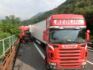 Am heutigen Nachmittag wurde die Mannschaft der Berufsfeuerwehr Bozen zu einem Einsatz auf die Autobahn gerufen. Bei Kilometer 79,3 war es zu einem Auffahrunfall zweier Sattelzüge gekommen. Dabei wurde die Fahrerkabine des aufgefahrenen Fahrzeuges stark beschädigt und der Fahrer wurde dabei eingeklemmt. Mit Hilfe hydraulischer Rettungsgeräte konnte der Verunfallte zwar innerhalb kürzester Zeit befreit werden, jedoch konnte der mit dem Hubschrauber eingetroffene Notarzt nur mehr den Tod feststellen. Durch die Sperrung der Südspur während der Rettungsarbeiten entstand größerer Rückstau auf der Autobahn und der Staatsstrasse, welcher sich erst nach Stunden auflöste. Am Einsatz beteiligt waren neben dieser Berufsfeuerwehr, die Freiwillige Feuerwehr Kardaun, der Rettungsdienst sowie die Autobahnpolizei.