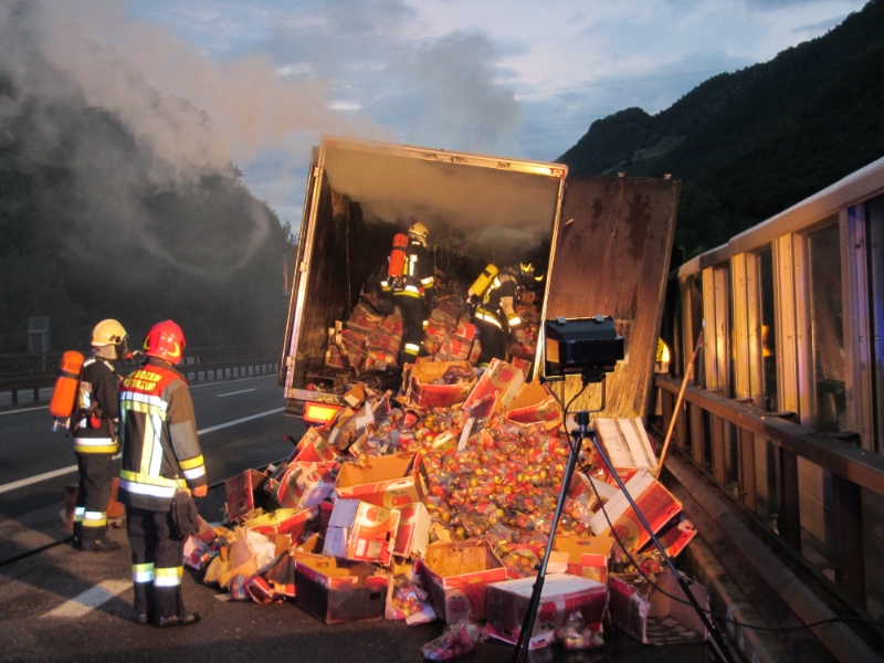 Wegen eines LKW-Brandes auf der Nordspur der Brennerautobahn, wurde heute Mittwoch, den 2. Juli 2014 um 04:10 Uhr die Berufsfeuerwehr Bozen zu einem Einsatz gerufen. Der Sattelzug war voll mit verpackten Äpfeln beladen, was die Löscharbeiten und das Entladen durch Rauch beschädigten Ware erschwerte.