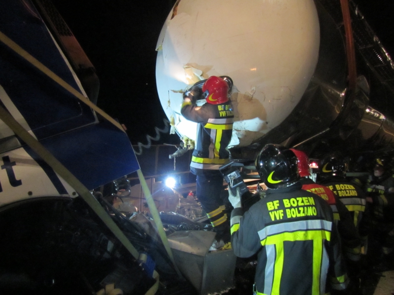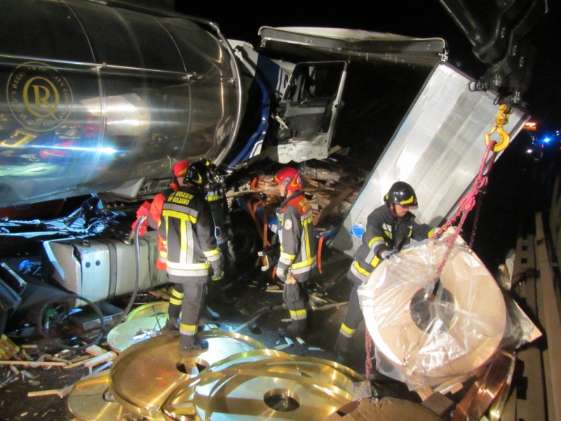 Am Freitagabend gegen 19:00 Uhr kam es auf der Nord Spur der A22 zwischen Bozen-Nord und Klausen zu einem schweren Verkehrsunfall. Ein mit flüssigem und erhitztem Kunststoff beladener Sattelzug fuhr auf einem mit Metallrollen beladenen Sattelzug auf. Dabei wurde der Fahrer des zweiten Fahrzeuges in seiner Fahrerkabine eingeklemmt. Er erlitt, ersten Prognosen nach, mittelschwere Verletzungen und musste mittels Hydraulischem Bergegerät befreit werden.