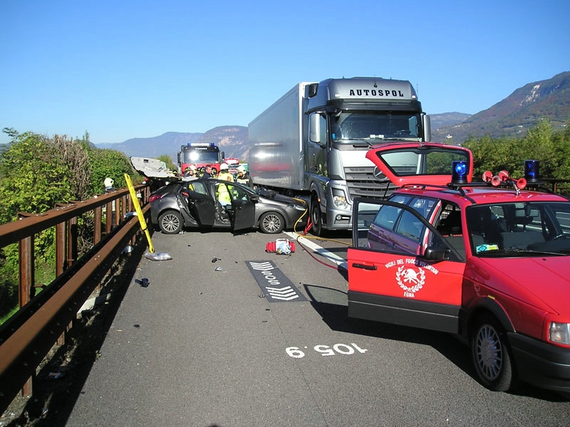 Zum Unfall kam es am Dienstag, den 27.10.2015 um 13.30 Uhr rund zweieinhalb Kilometer unterhalb der Einfahrt Neumarkt. "Ein Wagenlenker ist dabei mit seinem Pkw auf einen Sattelschlepper aufgefahren", berichtet Harald Schwarz, Offizier der Bozner Berufsfeuerwehr.