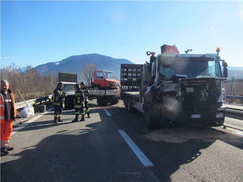 Heute Morgen um 10:20 Uhr rückte die Berufsfeuerwehr Bozen zu einem Unfall auf die Mebo bei km 221 aus. Beteiligt waren ein LKW mit Anhänger, welcher landwirtschaftliche Maschinen geladen hatte, und ein VW Transporter. Durch den Auffahrunfall gerieten beide Fahrzeug ins Schleudern und blockierten schließlich die gesamte Nordspur. Zwei Personen aus dem Kastenwagen wurden bei dem Unfall leicht bis mittelschwer verletzt und vom Rettungsdienst erstversorgt. Aufgrund der organisatorisch umfangreichen Aufräumarbeiten blieb die Straße für ca. 2,5 h gesperrt.