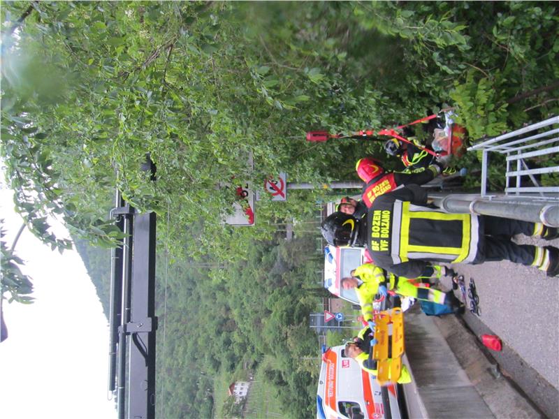 Nachdem ein unklarer Anruf, bei der Notrufzentrale 112 eingegangen war, wurde dieser an die Einsatzzentrale der Berufsfeuerwehr weitergeleitet. Gemeinsam wurde versucht den Anruf zu entziffern, was aber auf Grund fehlender Kommunikation des Anrufers äußerst schwierig war. Lediglich durch die Lokalisierung des eingegangenen Notrufs und der dazu passenden Hintergrundgeräusche von fließendem Wasser wurde entschieden eine Mannschaft zur Abklärung an die Kampiller Brücke bei Bozen zu schicken. Dort konnte nach kurzer Suche eine abgestürzte Person in ungefähr 5 Meter Tiefe, am Rande des Flusses, entdeckt werden. Die Person wurde von den Rettungssanitätern der Berufsfeuerwehr erstversorgt und dann mittels Seilwinde auf die Brücke gehoben. Dort wurde der Verletzte vom Notarzt behandelt und ins Krankenhaus gebracht. Im Einsatz standen auch das Weiße und Rote Kreuz, die Stadpolizei und die Carabinieri.