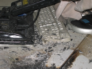 Um 23.00 Uhr erreichte uns in der Zentrale ein Notruf, daß dicke Rauckwolken aus einem Fenster des 3.Stockes eines Hauses in der Piavestrasse in Bozen drangen. Die Einsatzmannschaften der Berufsfeuerwehr, die unter Atemschutz bis zur Brandstelle vordrangen, trafen dort in einem Büro der Südtiroler Landesverwaltung auf einen brennenden Computer und eine danebenstehende Fotokopiermaschine. In kurzer Zeit hatten sie den Brand unter Kontrolle und mußten nur noch für eine gute Belüftung des Gebäudes sorgen.