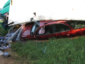 Ein nachfolgender Pkw wurde unter einem LKW begraben.