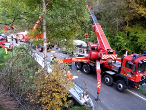 Heute gegen 16.45 wurde diese Berufsfeuerwehr zur Unterstützung der Freiwilligen Feuerwehren Lajen, Albions und Klausen zu einem schweren Verkehrsunfall auf der Strasse von Klausen Richtung Gröden gerufen. Ein vollbeladener Betonmischer ist aus ungeklärter Ursache während der Fahrt in Richtung Gröden umgekippt und hat dabei einen PKW des Typs Opel Vectra unter sich begraben. Zur Bergung des Fahrzeuges und Befreiung der beiden Insassen wurden zwei Autokräne der Berufsfeuerwehr benötigt. Für die beiden Insassen kam jede Hilfe zu spät. Im Einsatz waren weiters der Rettungsdienst Weisses Kreuz Klausen, Notarzteinsatzfahrzeug Brixen, Notfallseelsorge Brixen, Strassenpolizei, Carabinieri und der Strassendienst des Landes. Aufgrund des Unfalles war die Straße für mehrere Stunden gesperrt.