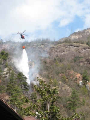 Am Ende machte der Hubschrauber noch einen letzten Wasserabwurf, wobei dem Wasser ein eigenes Brandverzögerungsmittel (aus roter Farbe) beigemengt wurde, damit keine neuen Brandherde auflodern können.