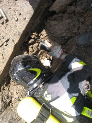 Um die Lage zu stabilisieren, wurde durch Männer der Berufsfeuerwehr Bozen unter schwerem Atemschutz und Wassernebel die Rohrleitung um die Leckage freigelegt und mittels Holzkeile und Dichtkissen abgedichtet.