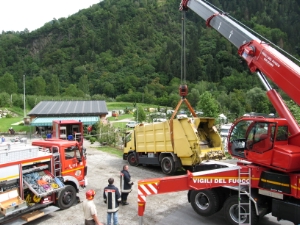Heute wurde gegen 11.00 Uhr die Berufsfeuerwehr Bozen zu einem technischen Einsatz nach Saltaus (Passeiertal) gerufen. Ein 20t Müllwagen war aufgrund eines Wendemanövers am Parkplatz des örtlichen Campingplatzes im weichen Untergrund eingebrochen. Der LKW geriet daraufhin in Schieflage und drohte über eine Böschungsmauer auf die darunter liegenden Zelte und Wohnwagen zu stürzen. Die Freiwillige Feuerwehr Saltaus führte Absperr- und Sicherungsarbeiten durch. Mittels zwei Greifzügen wurde der LKW in seiner Lage stabilisiert. Mit dem schweren Kranfahrzeug der Berufsfeuerwehr wurde der LKW schließlich angehoben und geborgen. Beim Unfall wurde niemand verletzt. Nach 2 Stunden konnte der Einsatz abgeschlossen werden.