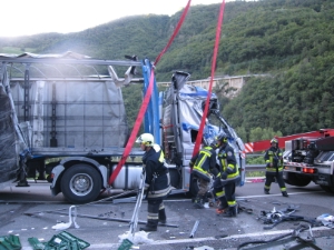 Ein LkW einer lokalen Firma war zur Seite gekippt und war an der Leitplanke entlang geschlittert. Dabei wurde der Fahrer so schwer verletzt, daß der eingetroffene Notarzt nur mehr seinen Tod feststellen konnte. In Zusammenarbeit mit den Freiwilligen Feuerwehren von Atzwang und Waidbruck befreite die Berufsfeuerwehr den Fahrer.