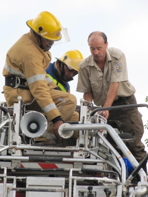 Zuerst mußten zwei Feuerwehrmitarbeiter dieser Berufsfeuerwehr, OBM Renner Rudi und FM Prinoth Olaf die Fahrzeuge und Geräte aus den Containern entladen und in Betrieb setzen, was doch einige Schwierigkeiten bereitete. Wahrscheinlich durch der salzhaltigen Meeresluft haben die Motoren einige Probleme bereitet, sodass die beiden Kollegen über mehrere Tage kleinere Reparaturen an den Fahrzeugen durchführen mußten.