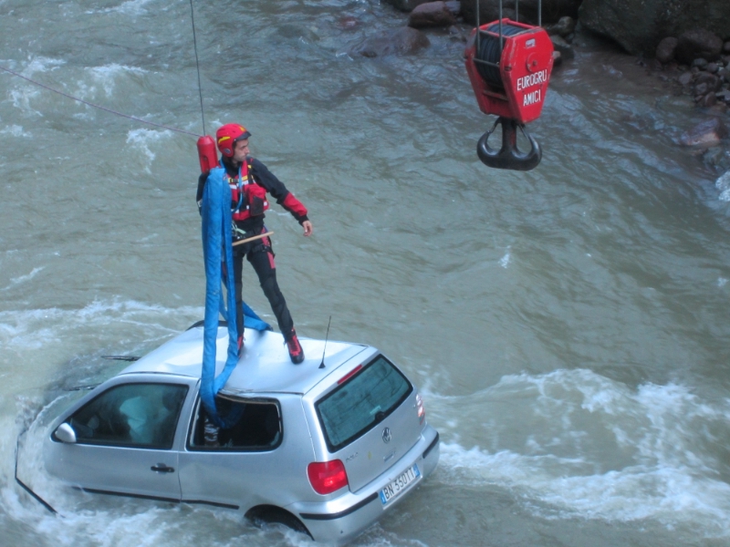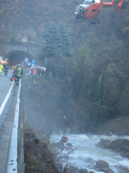 Foto BZBZGegen 08:30 des 13.11.2012 wurden die Wasserretter und die Kranmannschaft dieser Berufsfeuerwehr zusammen mit den örtlichen Freiwilligen Feuerwehren von Asfeld und Sarnthein, sowie Einheiten der Südtiroler Wasserrettung und Bezirkstaucher der Freiwilligen Feuerwehr zu einem Verkehsunfall ins Sarntal gerufen. Kurz vor Halbweg kam ein Fahrzeug aus ungeklärten Ursachen über die Straße und landete im Bachbett der Talfer, welche zur Zeit eine erhebliche Menge an Wasser führt. Eine Person befand sich noch im Fahrzeug und konnte erst durch den Einsatz der Seilwinde des Rettungshubschraubers Pelikan 1 gerettet werden. Dieser nahm zuvor zwei Wasserretter der Berufsfeuerwehr auf und brachte sie direkt zum Einsatzort. Die Person wurde trotz der schwerwiegenden Unfalldynamik nur leicht verletzt und wurde nach Erstversorgung durch den Notarzt des Pelikan 1 zur Kontrolle in Krankenhaus Bozen mit einem Rettungswagen des Weißen Kreuzes gefahren. Mittels schwerem Kranfahzeug wurde das Unfallfahrzeug anschließend aus dem Bachbett geborgen. Die Straße blieb für die Dauer der Aufräumungsarbeiten für ca. 1,5 Stunden gesperrt. Im Einsatz standen weiters die Carabinieri, Gemeindepolizei, der Bergrettungsdienst und der Landesstraßendienst