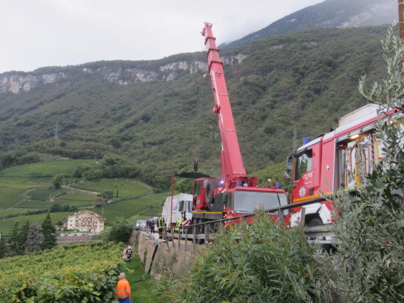 Gegen 14:00 Uhr geriet das Fahrzeug im Ortsteil St.Jackob bei Tramin, aus noch ungeklärten Umständen, gegen die Leiplanken der Hauptstraße, durchbrach diese zum Teil und kam schließlich zum Stehen. Der Fahrer konnte das Fahrzeug unverletzt verlassen, der LkW droht jedoch über die rund 3m hohe Stützmauer, auf den darunterliegenden Weinacker, zu stürzen. Nachdem die Feuerwehr Tramin das Fahrzeug mittels Hubzug gesichert hatte, wurde die Berufsfeuerwehr Bozen mit der Kranmannschaft zum Einsatzort gerufen. Die Bergung des Müllfahrzeuges gestaltet sich schwierig, da die Fahrbahn sehr schmal war und zudem eine Stromleitung den Bereich überquerte. Nach rund 3 Stunden Bergungsarbeit konnte das Fahrzeug wieder auf die Fahrbahn gehoben werden. Im Einsatz standen neben dieser Berufsfeuerwehr, die Freiwillige Feuerwehr Tramin und die Gemeindepolizei.