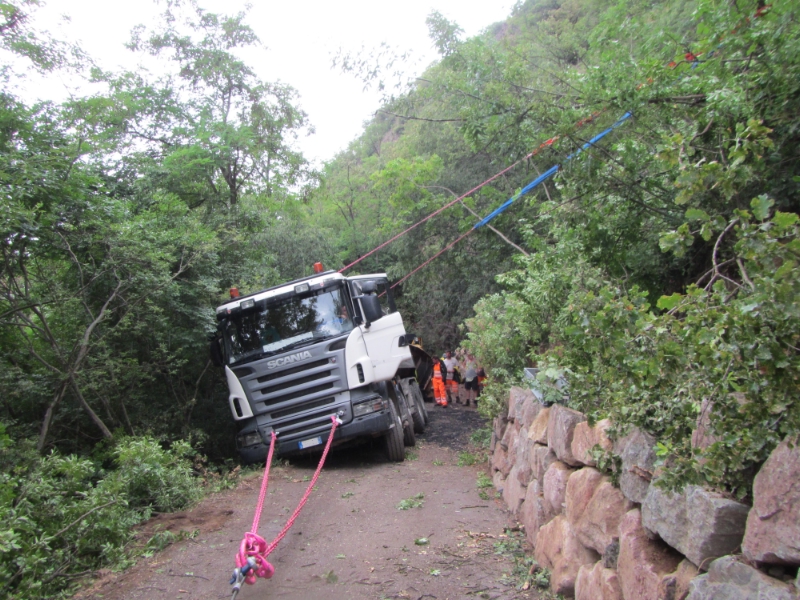Am späten Vormittag vom Dienstag, den 24.06.2014 so gegen 11:30 Uhr wurde die Kranmannschaft der Berufsfeuerwehr Bozen zur Unterstützung der Freiwilligen Feuerwehr von Terlan zu einem Einsatz am Planatschweg, oberhalb der Terlaner Weinstube, gerufen. Dort war ein mit 26 Tonnen Asphalt beladener LkW seitlich über den Fahrbahnrand hinausgeraten und drohte abzustürzen. Da bis zur Sicherung und der anschließenden Bergung die Gefahr bestand, dass das Schwerfahrzeug abrutscht, wurde ein darunterliegender Hof evakuiert und die Landesstraße für den Verkehr gesperrt. Die Bergungsarbeiten gestalteten sich schwierig, da das Gelände sehr steil und steinschlaggefährdet war. Auch die Sicherung des Fahrzeuges konnte erst nach stundenlangen Arbeiten im steilen Gelände gewährleistet werden. Zur Bergung wurde das entleerte Fahrzeug mittels Hubzügen gesichert und mit der Kranseilwinde auf die Fahrbahn zurückgezogen. Im Einsatz standen neben dieser Berufsfeuerwehr, die Freiwillige Feuerwehr von Terlan, Carabinieri, Gemeindepolizei und Landesstraßendienst.