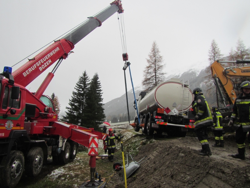 BF-BZ-VVF-BZAm 06.11.2014 um 10:40 wurde die Berufsfeuerwehr Bozen zu einem Kraneinsatz in Innerpens (Sarntal) gerufen. Ein Tankwagen, befüllt mit 15.000 l Heizöl einer Firma aus dem Trentino war auf einer Seitenstrasse eingebrochen und drohte ins Talferbach abzustürzen. Vorab wurde das Heizöl auf einem anderen Tankwagen derselben Firma umgefüllt und mit Hilfe des Krans der Berufsfeuerwehr und der Bagger der Firma Kral Tiefbau konnte das Fahrzeug angehoben und der Untergrund befestigt werden. Anschliessend konnte das Fahrzeug aus der misslichen Lage mittels Seilwinde gezogen werden. Der Tanklaster konnte seine Fahrt danach fortsetzen. Im Einsatz stand die Freiwillige Feuerwehr Pens und die Berufsfeuerwehr Bozen.