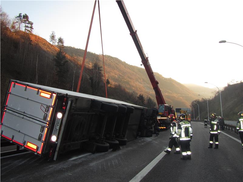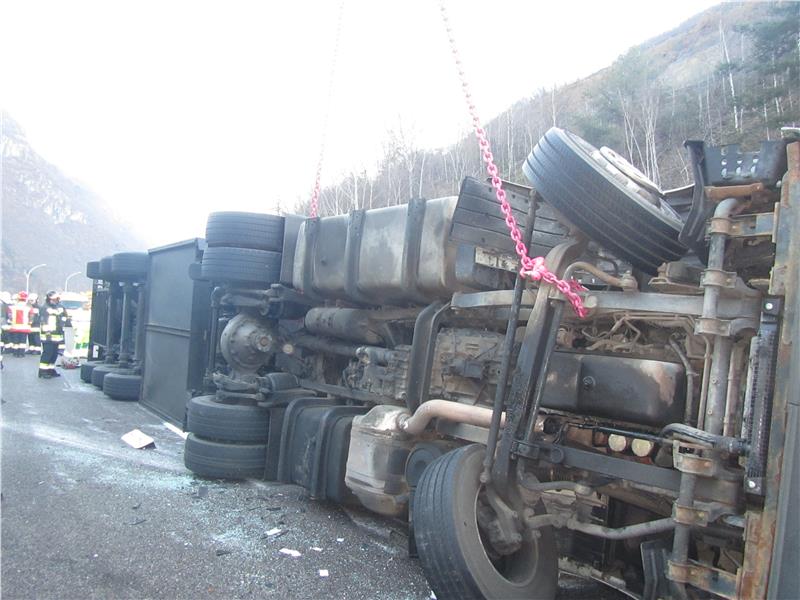 Gegen 07:00 Uhr in der Früh am Heiligen Abend führte ein zu gewagtes Fahrmanöver einer italienischen Speditionsfirma beim Einfahren in die Autobahn zum Umkippen des Fahrzeuges. Der Fahrer verletzte sich dabei nur leicht. Die Zugmaschine samt Anhänger kam auf der Überholspur seitlich zum Liegen und blockierte diese. Für die Aufrichtung des Fahrzeuges wurde diese Berufsfeuerwehr zusammen mit der Freiwilligen Feuerwehr von Klausen alarmiert. Die vollbeladene Ware in Form von Schweinskeulen mußte jedoch zunächst auf einen zweiten herbeigerufenen Kühlwagen umgeladen werden. Die arbeits- und zeitintensiven Arbeiten dauerten bis ca. 15:00 Uhr. Anschließend wurde der Kühltransporter mit dem Kranwagen dieser Bereufsfeuerwehr aufgerichtet und dem Abschleppunternehmen übergeben. Für die Dauer der Arbeiten blieb die Südspur der Autobahn nur auf der Normalspur geöffnet. Zeitweilig wurde auch ein Gegenverkehrsbereich auf der Nordspur eingerichtet. Zu ausgedehnten Staus kam es jedoch nicht, da sich das Verkehrsaufkommen am Heiligen Abend in Grenzen hielt. Im Einsatz standen neben der Berufsfeuerwehr Bozen und der Freiwilligen Feuerwehr von Klausen auch die Straßenmeisterei und Straßenpolizei der Autobahn A22, sowie ein Amtstierarzt der Sanitätseinheit von Brixen, welcher die Umladeaktion überwachte