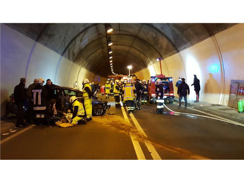 Gegen 15.15 prallten schliesslich zwei Fahrzeuge im Eggentaler Tunnel frontal zusammen. Dabei wurden mehrere Personen zum teil schwer Verletzt. Im Einsatz standen neben den Bozner Feuerwehren die Freiwilligen Feuerwehren Kardaun und Eggen. Auch das Weisse und Rote Kreuz sowie der Pelikan 1 und die Carabinieri standen im Einsatz.
