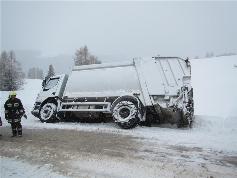 Diese Berufsfeuerwehr wurde am 02.02.2018 um 11:00 zur Unterstützung mit dem Kranwagen auf die Seiseralm gerufen. Ein Müllentsorgungsfahrzeug mit Biomüll war bei heftigem Schneefall auf schneebedeckter Straße bei einem Ausweichmanöver auf weichen Untergrund gekommen und so in Schieflage geraten. Da der LkW umzufallen drohte wurde vorerst mit einer Pistenraupe ein Schneewall aufgeschüttet, der das Umfallen des LkW´s und damit den Austritt des Hydrauliköls verhinderte. Mit einem Bagger vor Ort wurde die Straße von ca. 10 cm dickem Eis befreit um den Kranwagen in Position bringen zu können. Der ganze Einsatz dauerte ca. 4 Std. Vor Ort waren die Freiwillige Feuerwehr Seiseralm, der Strassendienst und die Berufsfeuerwehr Bozen.