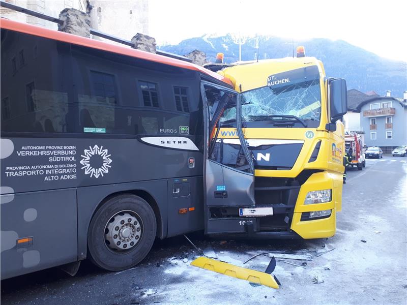 Am heutigen 06.12.2018 sind nach 12:30 Uhr innerhalb der Ortschaft Latsch im Vinschgau ein Bus eines südtiroler Linienunternehmens, in dem sich zum Zeitpunkt des Unfalls nur der Fahrer befand, und ein Sattelzug frontal zusammengestoßen.