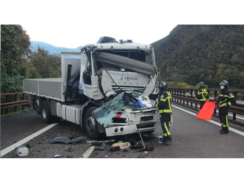 Bei einem Auffahrunfall fuhr ein schwerer Hängerzug auf das Hinterteil eines Sattelaufliegers auf. Beim heftigen Aufprall wurde die Kabine des Hängerzuges schwer verformt. Der LKW erlitt schwere Schäden, jedoch wurde der Fahrer des auffahrenden Fahrzeugs nur leicht verletzt. Er konnte selbst das Fahrzeug verlassen und wurde vom Rettungsdienst ins Krankenhaus Bozen gebracht. Der Fahrer des Sattelaufliegers bleib unverletzt, der LKW wurde abgeschleppt.