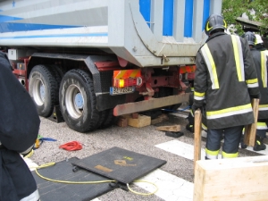 FOTO BFBZ - VVFBZAm Nachmittag des 11.10.2004 wurde die Berufsfeuerwehr Bozen zu einem schweren Verkehrsunfall in Frangart gerufen. Dabei wurde eine junge Frau von einem LKW überrollt und blieb unter der Hinterachse des LKW’s eingeklemmt. Während der herbeigerufene Notarzt des Weissen Kreuzes nur noch den bereits eingetretenen Tod feststellen konnte, musste die Berufsfeuerwehr Bozen zusammen mit der Freiwilligen Feuerwehr Frangart den LKW mittels pneumatischen Hebekissen anheben um die Frau zu bergen. Im Einsatz standen auch die Carabinieri aus Eppan.