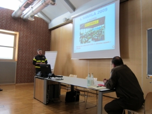 Nach einer Begrüßung durch den Kommandanten der Berufsfeuerwehr Bozen, Dr.-Ing. Ernst Preyer, referierte Franco Magrin, Offizier der Berufsfeuerwehr Belluno über die Organisation der Staatlichen Feuerwehr in Italien, mit besonderem Schwerpunkt auf die Strukturierung und die Abläufe im Falle eines Katastropheneinsatzes. Der Organisatorische Aufbau wurde dann am Beispiel des Erdbebeneinsatzes in l'Aquila den Teilnehmern erklärt.