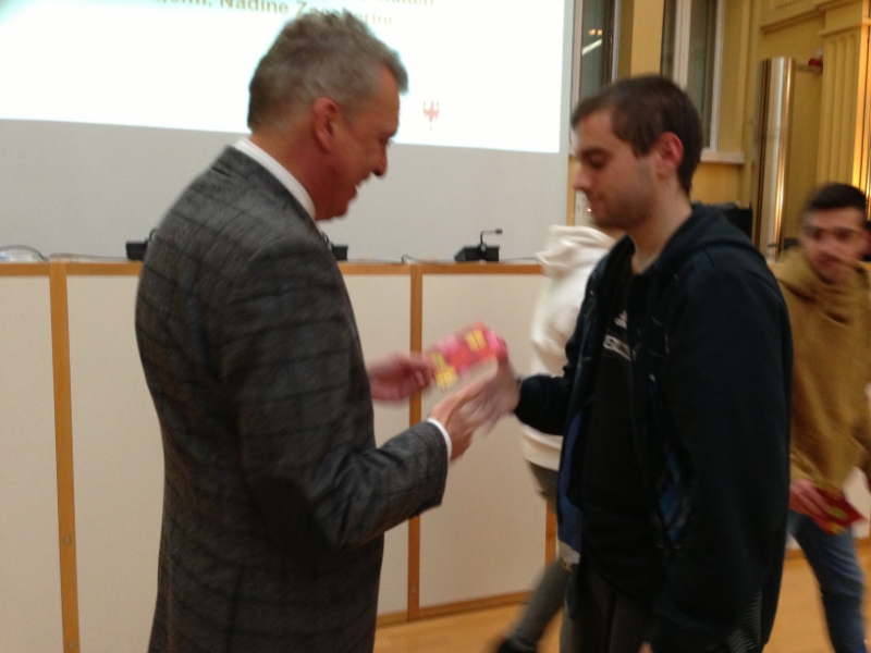 L'assessore provinciale alle cooperative Roberto Bizzo premia il progetto "CasaNonno" 1° classificato alla CoopCup 2012