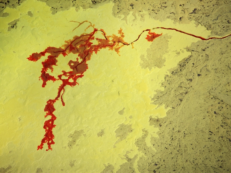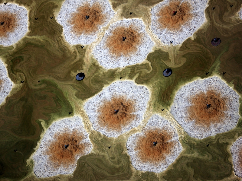 Tra i soggetti immortalati troviamo, ad esempio, due fotografie di un impianto di lavorazione delle sabbie bituminose a Fort McMurray, in Canada. Così, ecco la vivacissima immagine di un rigagnolo di zolfo fuso, sottoprodotto di scarto di tale procedimento. Dopo essere stato rimosso dalle sabbie, lo zolfo viene pompato allo stato liquido in grandi discariche di sedimentazione. Il suo colore rosso intenso è causato dall'elevata temperatura (200°C).